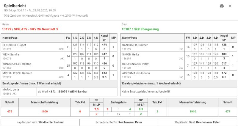 Der Start gehörte Günther und Heike. Günther zeigte eine solide Leistung mit 438 Holz und erkämpfte sich auf der letzten Bahn noch einen Satzpunkt. Heike hingegen hatte zu Beginn Schwierigkeiten, fand aber nach zwei schwachen Bahnen zurück ins Spiel. Mit 483 Holz sicherte sie sich drei Satzpunkte sowie den Mannschaftspunkt.