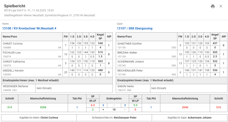 Letztlich endete das Spiel mit einem gerechten Unentschieden, da uns am Ende nur 18 Kegel zum Sieg fehlten. Wir gratulieren den Damen vom KV Kronlachner zu ihrer starken Leistung und danken auch unserer Mannschaft für den tollen Kampfgeist, der bis zur letzten Bahn sichtbar war. Es war ein würdiger Abschluss einer intensiven Saison!