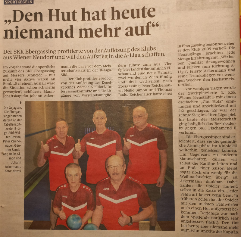 Einst verfügte der Sportkegelklub Ebergassing im Ligabetrieb über drei Teams. „Das war einmal in der Blütezeit des Klubs“, erinnert sich Teamkapitän Johann Ackermann. Seit vielen Jahren ist der Klub auf der Suche nach Räumlichkeiten für eine Viererbahn, die einen Aufstieg in die Landesliga ermöglichen würde. Bisher ohne Erfolg. Derzeit verfügt der Verein nur über zwei Bahnen. „Wir waren fünf Mal hintereinander Meister, konnten aber nie aufsteigen“, so Ackermann.